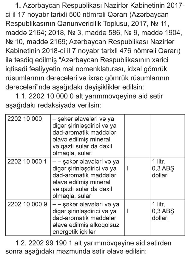 Qərara əsasən, şəkər əlavələri və ya digər şirinləşdirici və ya dad-aromatik maddələr əlavə edilmiş mineral və qazlı sular da daxil olmaqla, sular 1 litri üçün 0,3 ABŞ dolları, şəkər əlavələri və ya digər şirinləşdirici və ya dad-aromatik maddələr əlavə edilmiş alkoqolsuz energetik içkilər 1 litri üçün 0,3 ABŞ dolları, meyvə və tərəvəz şirəsi əsaslı alkoqolsuz energetik içkilər üçün 15.12.2019-cu il tarixinədək 15 %, lakin 1 litri 0,7 ABŞ dollarından az olmamaq şərtilə, alkoqollu energetik içkilər 1 litri üçün 2,0 ABŞ dolları, tərkibində tütün olan siqarlar, ucları kəsilmiş siqarlar və siqarillalar: siqarlar, o cümlədən ucları kəsilmiş siqarlar 1000 ədədi üzrə 0,5 ABŞ dolları, elektron siqaretlər üçün maye - 1 kq-ı üzrə 1 ABŞ dolları müəyyən edilib.
