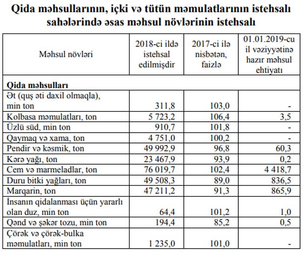 2018-ci ildə pendir, kəsmik, kərə yağı istehsalı da azalıb. Kərə yağı istehsalı 6,1% azalaraq 23 467,9 tona geriləyib.