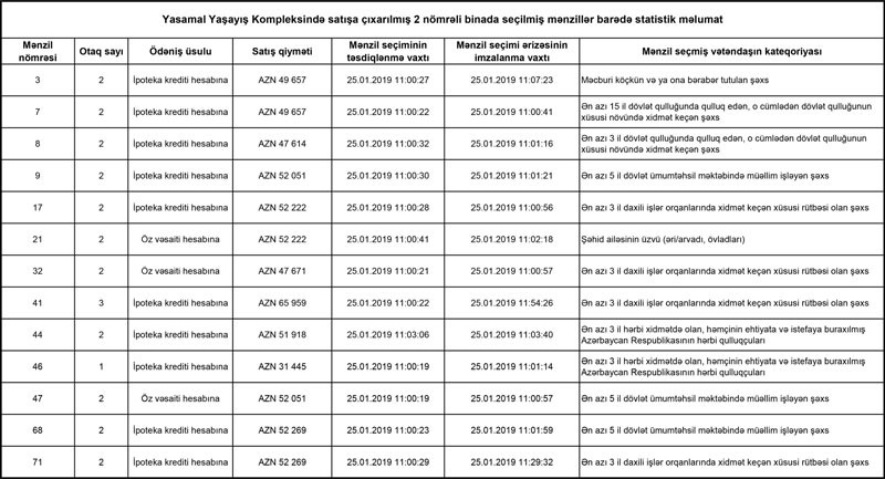 Yasamal Yaşayış Kompleksinin 1-5 saylı binaları üzrə 46 mənzil, həmçinin 6 və 7 saylı binalarında yerləşən 128 mənzilin, ümumilikdə 174 mənzilin seçimi 25.01.2019-cu il tarixində başa çatdırılmışdır.