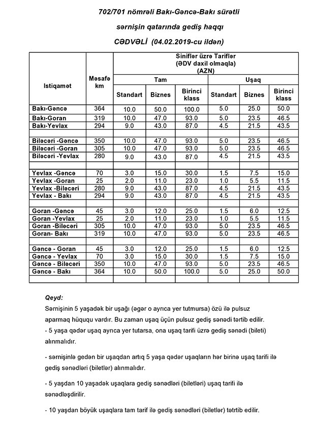 Gediş haqqı tariflərinə gəlincə, standart vaqonlarda qiymət 15 manatdan 10 manata endiriləcək.