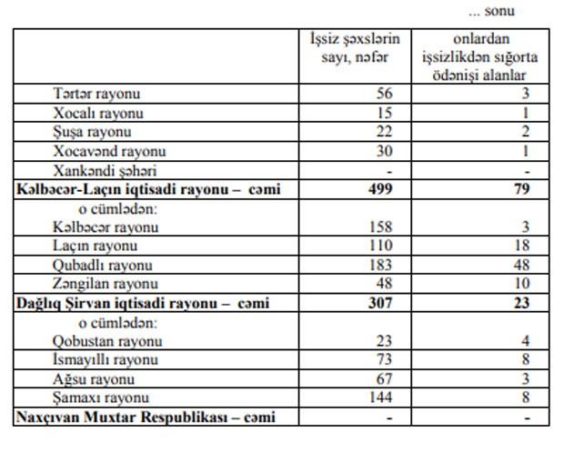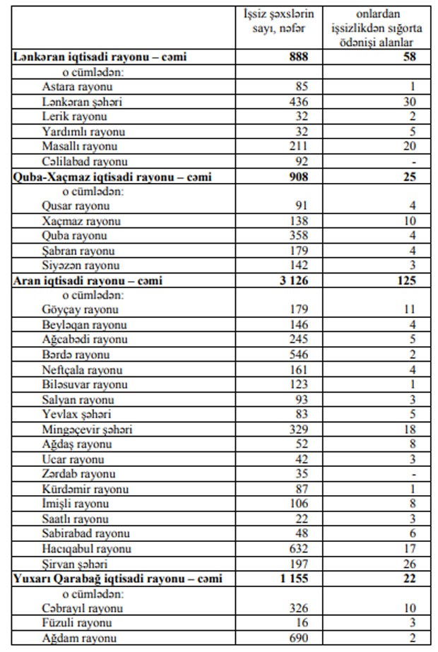 Azərbaycanda ən az işsiz Daşkəsəndə (3 nəfər), Bakı xaric ən çox işsiz isə Ağdamdadır (690 nəfər).