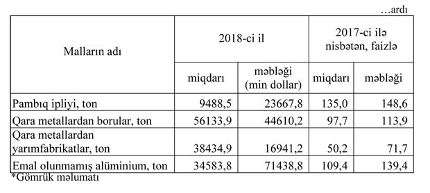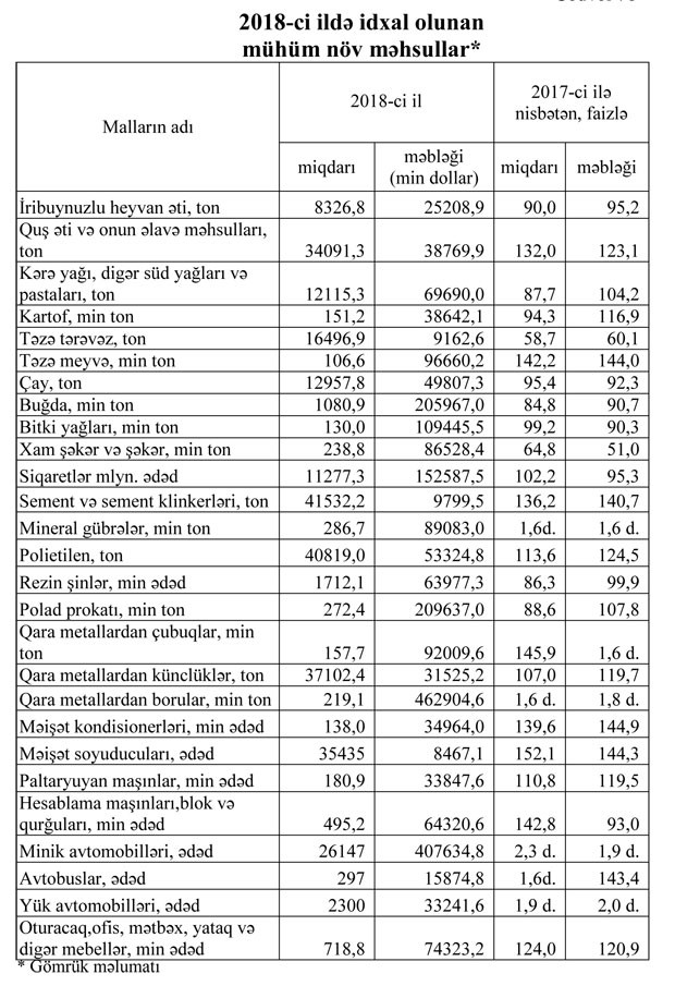 2018-ci ildə Azərbaycana idxal və idxal olunmuş mühüm növ məhsullar.