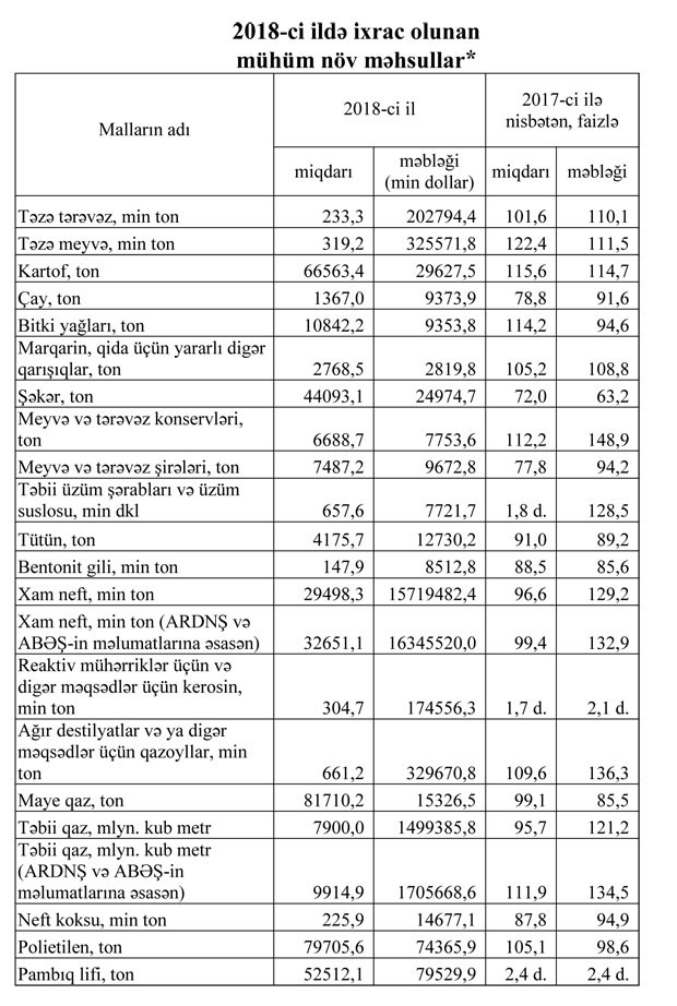 2018-də idxal və ixrac olunmuş mühüm növ məhsullar - CƏDVƏL