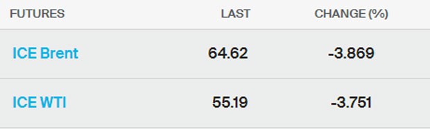 Bakı vaxtı ilə saat 21:45-ə olan məlumata görə, Brent nefti 3,8% ucuzlaşma ilə 64,62 dollardan alıcı tapıb.