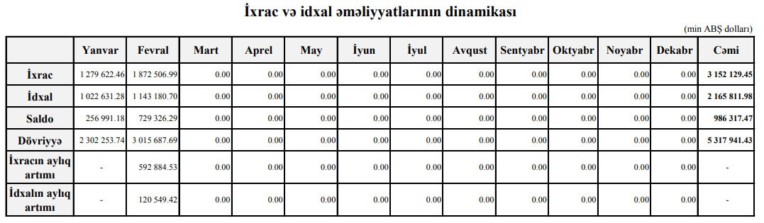 Fevralda ixracın məbləği 1 milyard 872 milyon 506 min dollar, idxalın məbləği isə 1 milyard 143 milyon 181 min dollar, saldo müsbət 729 milyon 326 min dollar təşkil edib. Cari ilin Yanvarında ixracın məbləği 1 milyard 279 milyon 622 min dollar, idxalın məbləği 1 milyard 22 milyon 631 min dollar, saldo isə müsbət 256 milyon 991 min dollar təşkil etmişdi.
