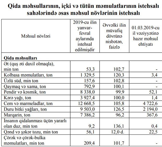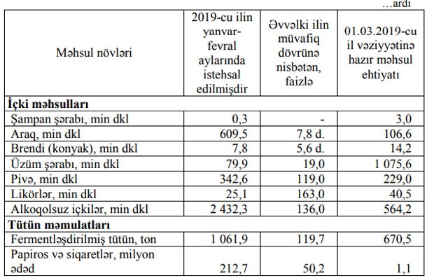 2018-ci ilin yanvar-fevral ayları ilə müqayisədə 2019-cu ilin yanvar-fevral aylarındaiçki istehsalında 63,4 faiz, qida məhsullarının istehsalında 23,2 faiz artım, tütün məmulatlarının istehsalında isə 32,1 faiz azalma müşahidə olunmuşdur.
