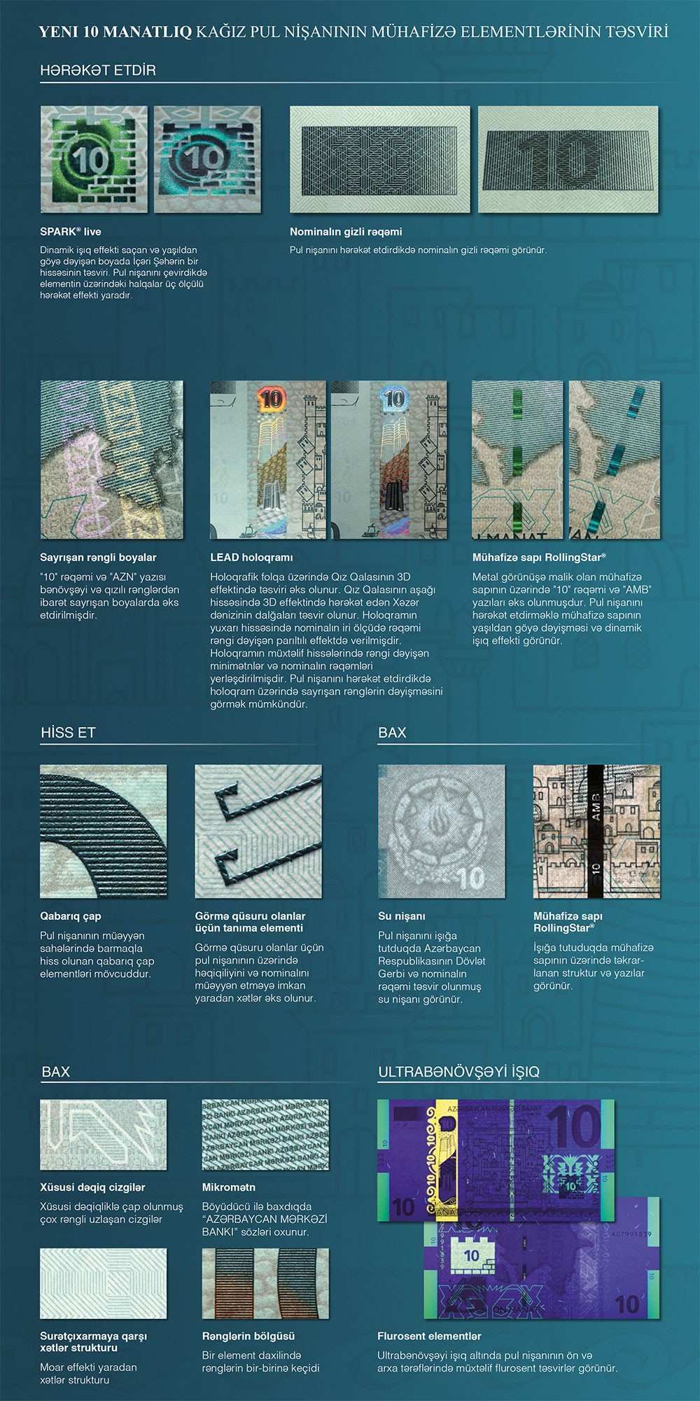 "Mərkəzi Bank tərəfindən dizayn mövzusu “Azərbaycan tarixinə” həsr olunmuş 10 manatlıq pul nişanının təkmilləşdirilməsi və mühafizə elementlərinin müasirləşdirilərək daha yüksək standartlara uyğulaşdırılması həyata keçirilmişdir.