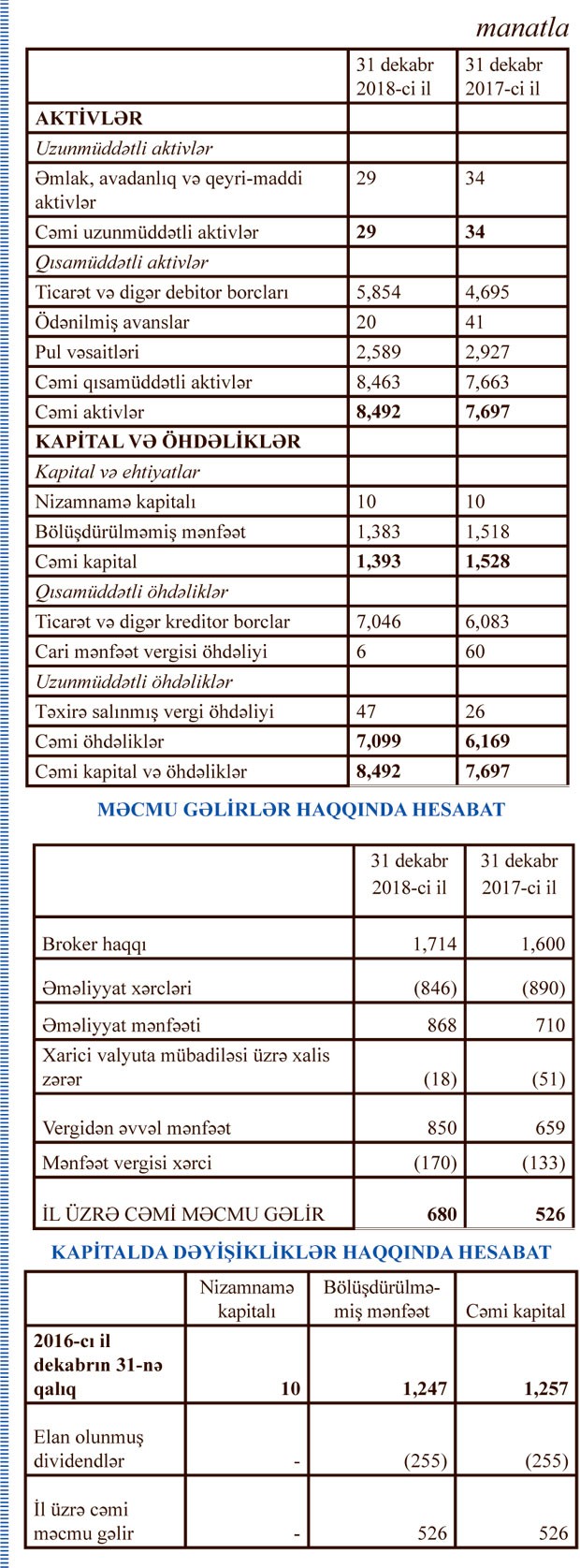Ötən il sığorta və təkrarsığorta brokerinin gəlirləri 1,714 milyon manat, xərcləri 864 min manat, mənfəət vergisi ödəmələri isə 170 min manat təşkil edib.