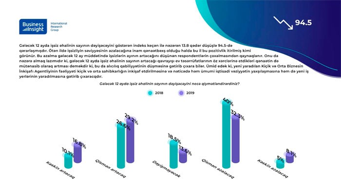 Ötən ildə işsizliyin səviyyəsinin azalacağına inam qənaətbəxş olduğu halda bu il bu pozitivlik itirilmiş kimi görünür. Bu azalma gələcək 12 ay müddətində işsizlərin sayının artacağını düşünən respondentlərin çoxalmasından qaynaqlanır.