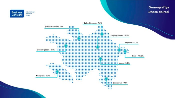 Araşdırma ölkənin bütün coğrafi zonalarını əhatə etməklə Bakı şəhəri daxil olmaqla Azərbaycanın 9 iqtisadi rayonunda, 20-70 yaş arası 1401 respondentlə həyata keçirilmişdir. Tədqiqat təsadüfi seçilmiş ailələr arasında könüllülük prinsipi ilə aparılmışdır. Tədqiqat üçün seçmə hər coğrafi zona üzrə ayrıca olaraq “bütün əhali” kateqoriyası üzrə məlumatların reprezentativliyinin təmin olunması prinsipi üzrə aparılmışdır.