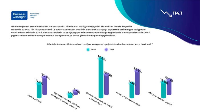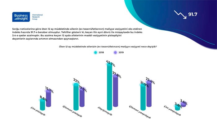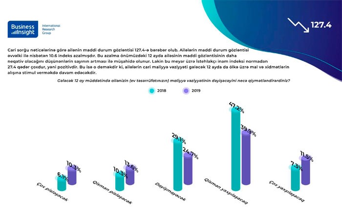 Təhlillər göstərir ki, keçən ilin eyni dövrü ilə müqayisədə bu indeks 3.4-ə qədər azalmışdır. Bu azalma keçən 12 ayda ailələrinin maddi vəziyyətinin pisləşdiyini deyənlərin saylarında artmın olmasından qaynaqlanır.