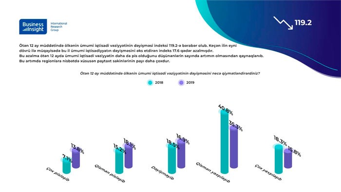 Ötən 12 ay müddətində ölkənin ümumi iqtisadi vəziyyətinin dəyişməsi indeksi 119.2-ə bərabər olub.