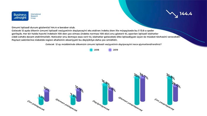 Gələcək 12 ayda ölkənin ümumi iqtisadi vəziyyətinin dəyişəcəyini əks etdirən indeks ötən illə müqayisədə bu il 13.6-a qədər geriləyib. Hər bir halda hazırki indeksin 100-dən çox olması (indeks norması 100-dür) onu göstərir ki, aparılan iqtisadi islahatlar ciddi cəhdlə davam etdirilməlidir. Nəticələr onu deməyə əsas verir ki, islahatlar gələcəkdə ölkə iqtisadiyyatı üçün öz müsbət tövhəsini verəcəkdir. Paytaxt sakinlərinə nisbətdə region əhalisinin əksəriyyəti bu dəyişikliyə daha çox ümidlidir.