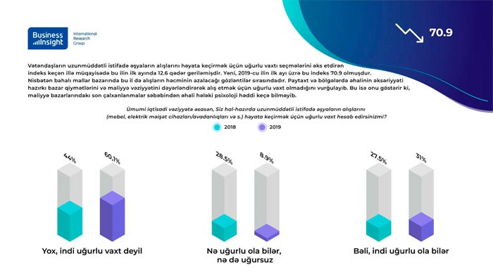 Vətəndaşların uzunmüddətli istifadə əşyaların alışlarını həyata keçirmək üçün uğurlu vaxtı seçmələrini əks etdirən indeks keçən illə müqaisədə bu ilin ilk ayında 12.6 qədər geriləmişdir. Nisbətən bahalı mallar bazarında bu il də alışların həcminin azalacağı gözləntilər sırasındadır. Paytaxt və bölgələrdə əhalinin əksəriyyəti hazırkı bazar qiymətlərini və maliyyə vəziyyətini dəyərləndirərək alış etmək üçün uğurlu vaxt olmadığını vurğulayıb. Bu isə onu göstərir ki, maliyyə bazarlarındakı son çalxanlanmalar səbəbindən əhali hələki psixoloji həddi keçə bilməyib.