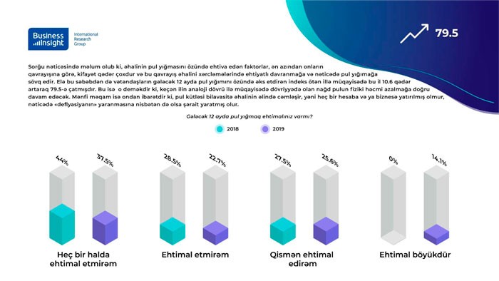 Onu da nəzərə almaq lazımıdır ki, gələcək 12 ayda işsiz əhalinin sayının artacağı qavrayışı ev təsərrüfatlarının öz xərclərinə etdikləri qənaətin də mütənasib olaraq artması deməkdir ki, bu da alıcılıq qabiliyyətinin düşməsinə gətirib çıxara bilər.