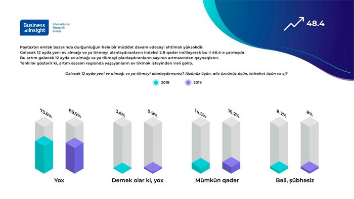 Gələcək 12 ayda yeni ev almağı və ya tikməyi planlaşdıranların indeksi 2.8 qədər irəliləyərək bu il 48.4-ə çatmışdır. Bu artım gələcək 12 ayda ev almağı və ya tikməyi planlaşdıranların sayının artmasından qaynaqlanır.