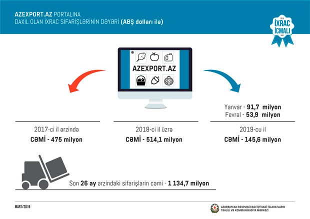 Bu ilin ilk iki ayında Azexport.az portalına 145,6 milyon ABŞ dolları dəyərində ixrac sifarişi daxil olub
