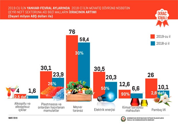 2018-ci ilin müvafiq dövrü ilə müqayisədə cari ilin yanvar-fevral aylarında pambıq lifinin ixracı 2,6 dəfə, alkoqollu və alkoqolsuz içkilərin ixracı 2,5 dəfə, kimya sənayesi məhsullarının ixracı 90 faiz, elektrik enerjisinin ixracı 50 faiz, meyvə-tərəvəzin ixracı 30 faiz, plastmassa və onlardan hazırlanan məmulatların ixracı 26 faiz artıb.