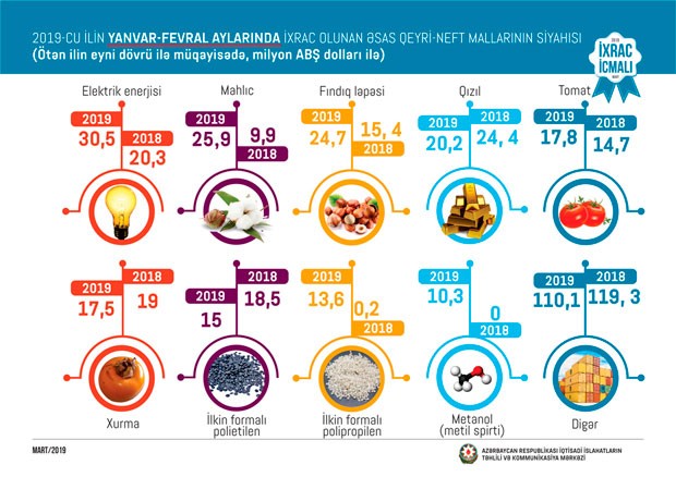 2019-cu ilin yanvar-fevral ayları ərzində ixrac edilən qeyri-neft sektoruna aid malların siyahısında elektrik enerjisi (30,5 milyon ABŞ dolları) birinci olub. Bu siyahıda mahlıc (25,9 milyon ABŞ dolları) ikinci, qabığı təmizlənmiş meşə fındığı isə (24,7 milyon ABŞ dolları) üçüncü yerdə qərarlaşıb.