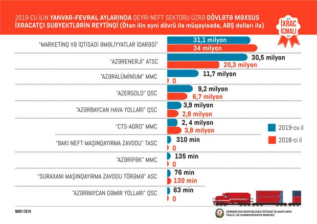 2019-cu ilin fevral ayında isə qeyri-neft sektoru üzrə ixrac 144 milyon ABŞ dolları təşkil edib. 2019-cu ilin fevral ayında qeyri-neft sektoruna aid ən çox mal ixrac edilən ölkələrin siyahısında Türkiyə (38,3 milyon ABŞ dolları) birinciliyə yüksəlib. Bu siyahıda Rusiya ikinci (35,7 milyon ABŞ dolları) və Gürcüstan üçüncü (23,4 milyon ABŞ dolları) olub.
