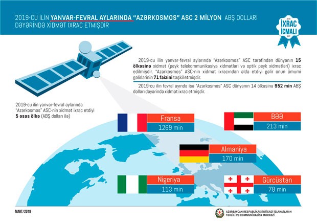 Cari ilin ilk iki ayı ərzində Rusiyaya 82 milyon, Türkiyəyə 63,6 milyon, Gürcüstana 37 milyon, İsveçrəyə 20,6 milyon və İrana 8,5 milyon ABŞ dolları dəyərində qeyri-neft sektoruna aid mal ixrac olunub. 2018-ci ilin müvafiq dövrü ilə müqayisədə 2019-cu ilin yanvar-fevral ayları ərzində Rusiyaya qeyri-neft ixracı 21%, Gürcüstana 13% və İrana 2,1 dəfə artıb.