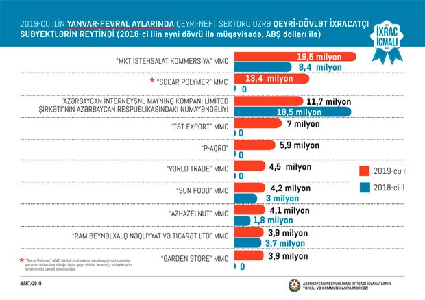 Cari ilin yanvar-fevral ayları üzrə hazırlanan qeyri-dövlət ixracatçı subyektlərin reytinqində ilk onluqda aşağıdakı şirkətlər təmsil olunurlar: "MKT İstehsalat Kommersiya" MMC, “Socar Polymer” MMC, "Azərbaycan İnterneyşnl Mayninq Kompani Limited Şirkəti"nin Azərbaycan Respublikasındakı nümayəndəliyi, "TST Export" MMC, "P-Aqro" MMC, "Vorld Trade" MMC, "Sun Food" MMC, “Azhazelnut” MMC, "Ram Beynəlxalq Nəqliyyat və Ticarət LTD" MMC, "Garden Store" MMC.