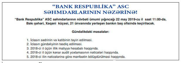 Mayın 22-də, saat 11:00-da "Bank Respublika" ASC-nin səhmdarlarının növbəti ümumi yığıncağı keçiriləcək.