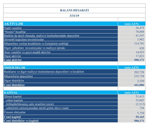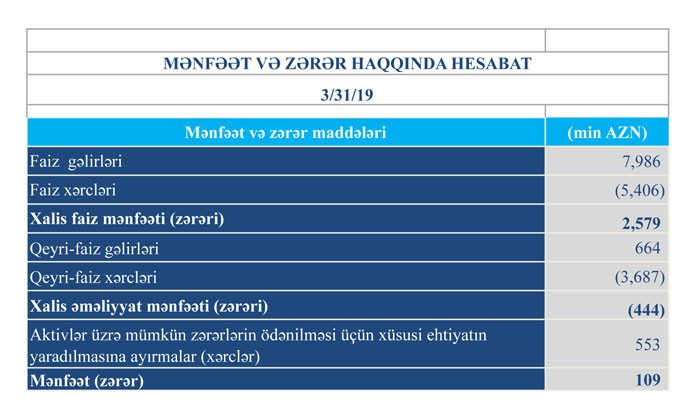 Müqayisə üçün qeyd edək ki, 2018-ci ilin yanvar-mart dövründə “TuranBank”ın cəmi gəlirləri 8 milyon 53 min manat, cəmi xərcləri 8 milyon 123 min manat, əməliyyat zərəri 70 min manat təşkil etmişdi. Bank aktivlər üzrə mümkün zərərlərin ödənilməsi üçün xüsusi ehtiyatın yaradılmasına 146 min manat da ayrıldığından zərər 216 min manata yüksəlmişdi.