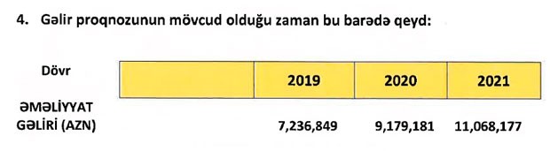 “Marja” şirkətə istinadən xəbər verir ki, 2019-cu ildə əməliyyat gəlirinin 7 milyon 237 min manata, 2020-ci ildə 9 milyon 179 min manata, 2021-ci ildə isə 11 milyon 68 min manata yüksələcəyi gözlənilir.