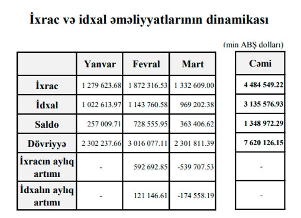 Martda ixrac 1 milyard 332 milyon 609 min dollar, idxal 969 milyon 202 min dollar, saldo müsbət 363 milyon 406 min dollar təşkil edib. Fevralda ixrac 1 milyard 872 milyon 316 min dollar, idxal 1 milyard 143 milyon 760 min dollar, saldo müsbət 728 milyon 555 min dollar təşkil etmişdi.