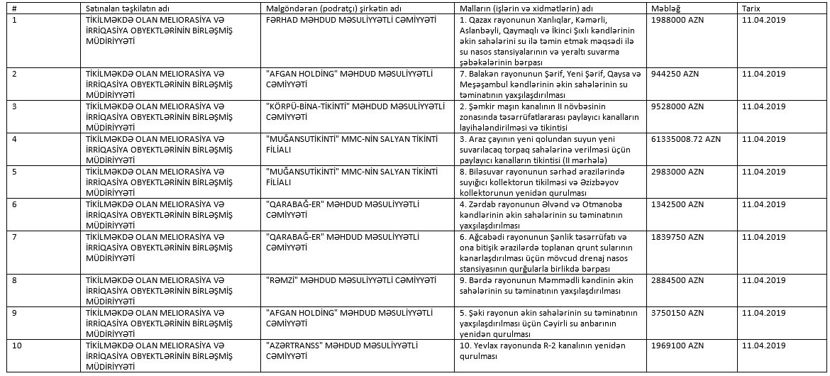 Ən böyük müqavilə "Muğansutikinti" ASC ilə imzalanıb: 61 milyon 335 min manat. Müqavilə Araz çayının yeni qolundan suyun yeni suvarılacaq torpaq sahələrinə verilməsi üçün paylayıcı kanalların tikintisini (II mərhələ) nəzərdə tutur.