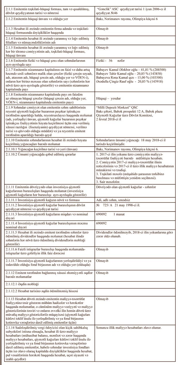 “Gənclik” ASC-nin 2018-ci il dekabrın 31-nə illik hesabatı