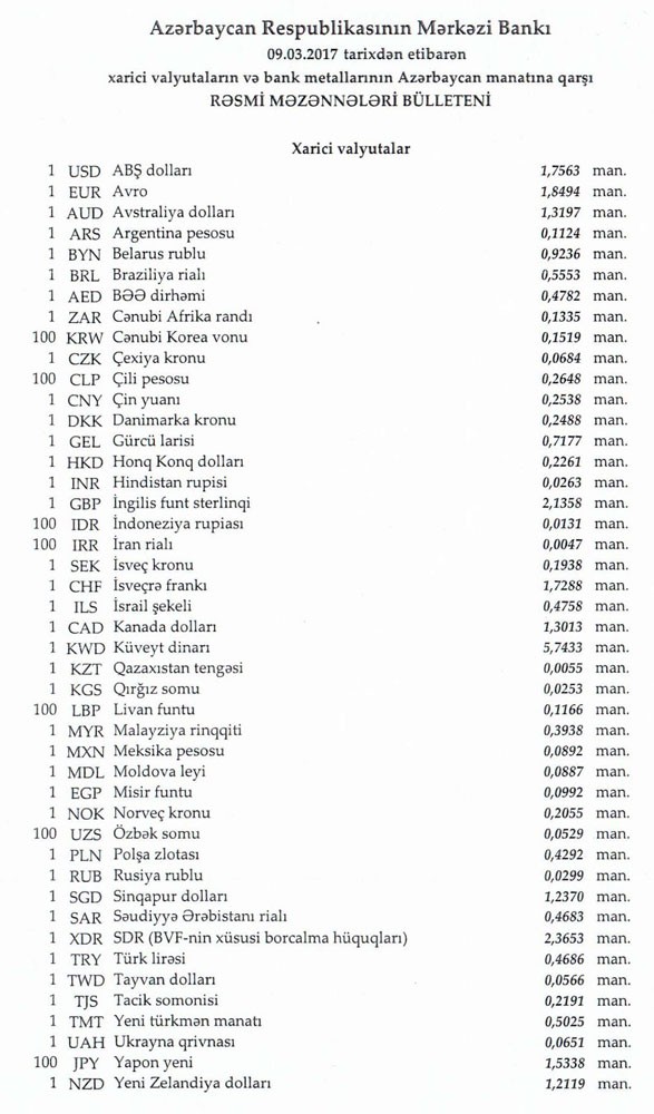 Martın 9-na Mərkəzi Bankın açıqladığı rəsmi Dollar/manat məzənnəsi Martın 7-i ilə müqayisədə qalxaraq 1,7563 manata qalxıb, Avro/manat məzənnəsi isə 1.8494 manata düşüb.