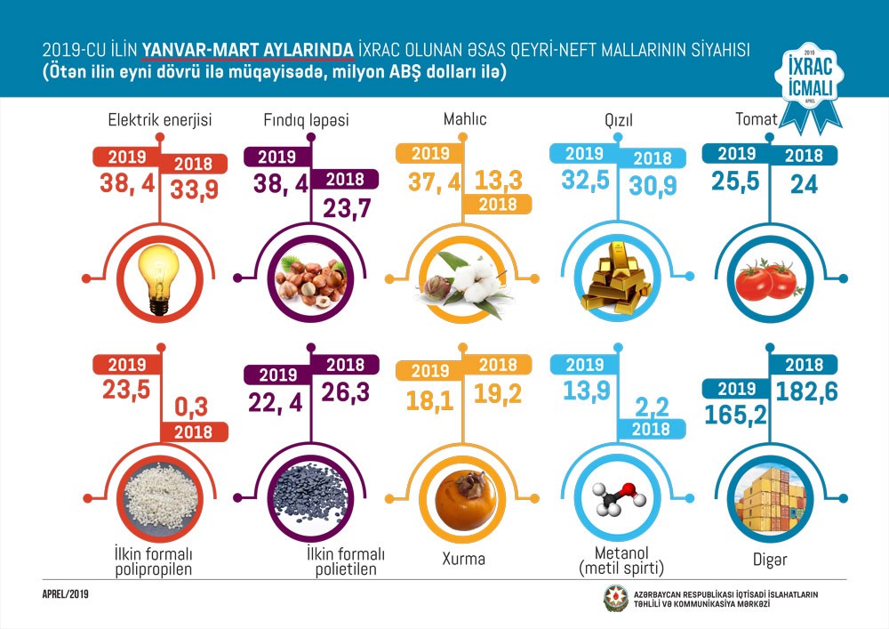 İcmalın bu sayında göstərilir ki, 2019-cu ilin yanvar-mart ayları ərzində Azərbaycan Respublikasının ixracı 4,5 milyard ABŞ dolları təşkil edib və ötən ilin müvafiq dövrünə nisbətən 1,1 milyard ABŞ dolları və ya 34 faiz artıb. Bu müddətdə qeyri-neft sektoru üzrə ixrac isə 415 milyon ABŞ dolları olub. 2018-ci ilin müvafiq dövrü ilə müqayisədə 2019-cu ilin yanvar-mart ayları ərzində qeyri-neft sektoru üzrə ixrac 59 milyon ABŞ dolları və ya 16,5 faiz artıb. Bu ilin birinci rübü ərzində Rusiyaya 115 milyon, Türkiyəyə 99 milyon, Gürcüstana 50 milyon, İsveçrəyə 33,7 milyon və İrana 12,7 milyon ABŞ dolları dəyərində qeyri-neft sektoruna aid mal ixrac edilib.
