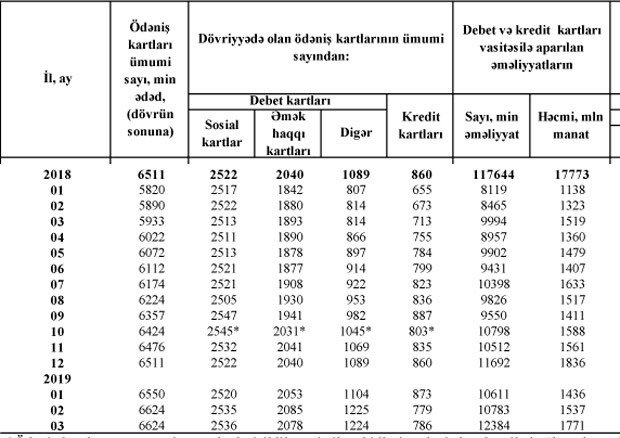 2018-ci ilin sonu ilə müqayisədə isə yanvar-mart ayları ərzində cəmi ödəniş kartlarının sayı 113 min ədəd, o cümlədən sosial kartların sayı 14 min ədəd, əmək haqqı kartlarının sayı 38 min ədəd, sosial kart və əməkhaqqı kartı olmayan digər debet kartlarının sayı isə 135 min ədəd artıb. Kredit kartlarının sayı isə 74 min ədəd azalıb.