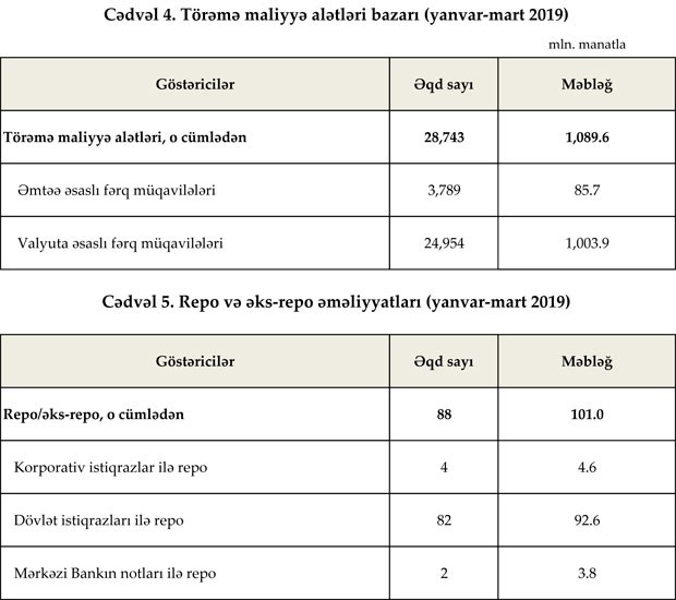 Əməliyyatların 73.2%-i (4 milyard 144.8 milyon manat) ilkin bazarda, 26.8%-i (1 milyard 518.7 milyon manat) isə təkrar bazarda aparılıb. Belə ki, cari ilin yanvar-mart ayları ərzində qiymətli kağızların ilkin bazarı ötən ilin müvafiq dövrü ilə müqayisədə 36% (1 milyard 103.2 milyon manata) artıb.