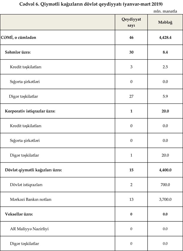 Hesabat dövründə dövlət qiymətli kağızları bazarında əqdlərin həcmi ötən illə müqayisədə 41% (2 milyard 608.2 milyon manat) artaraq 3 milyard 671.8 milyon manat təşkil edib. Bunun 227.5 milyon manatını Maliyyə Nazirliyinin istiqrazları, 3 milyard 444.3 milyon manatını isə Mərkəzi Bankın notları təşkil edib. Dövr ərzində dövlət istiqrazlarının yerləşdirilməsi üzrə 8 hərrac, Mərkəzi Bankın notlarının yerləşdirilməsi üzrə isə 13 hərrac keçirilib və müvafiq olaraq, 151.8 milyon manat və 3 milyard 363.1 milyon manat məbləğində yerləşdirmə olub.