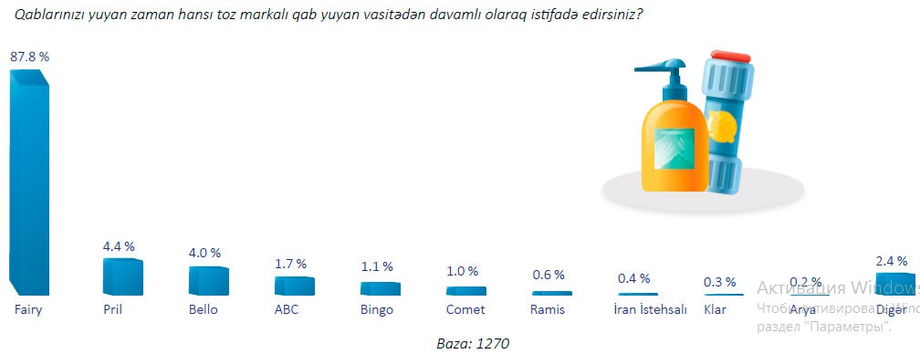 “Marja” araşdırmaya istinadən xəbər verir ki, respondentlər "Paltarlarınızı yuyan zaman yuyucu toz markalarından hansılarını davamlı olaraq istifadə edirsiniz?" və "Qablarınızı yuyan zaman hansı toz markalı qab yuyan vasitədən davamlı olaraq istifadə edirsiniz?" suallarına da cavab veriblər.