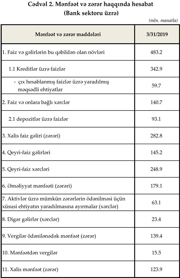 2019-cu ilin 1-ci rübündə bankların cəmi gəlirləri (faiz və qeyri-faiz gəlirləri) 628,4 milyon manat, cəmi xərcləri (faiz və qeyri-faiz xərcləri) isə 449,3 milyon manat təşkil edib.