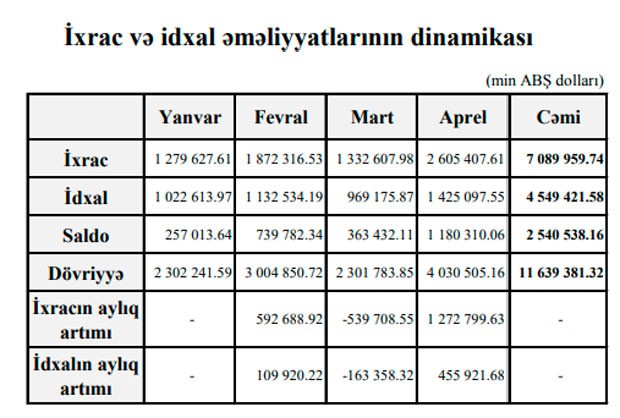 Apreldə ixrac 2 milyard 605 milyon 407 min dollar, idxal 1 milyard 425 milyon 97 min dollar, saldo müsbət 1 milyard 180 milyon 310 min dollar təşkil edib.