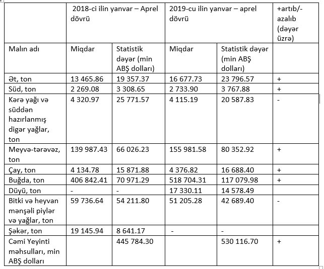 2019-cu ilin yanvar-aprel dövründə Azərbaycana 530 milyon 116 min dollar dəyərində yeyinti məhsulları idaxl olunub. Bu, ötən ilin eyni dövrü ilə müqayisədə 84 milyon 332 min dollar və ya 19% çoxdur.