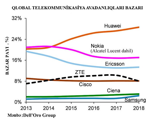 "Marja" xəbər verir ki, "Huawei" telekommunikasiya avadanlıqları bazarında 2014-cü ildə "Nokia"nı keçərək bazar liderliyini ələ keçirib və o tarixdən bəri bazar payını artırır. "Huawei" 2018-ci ilin sonunda 29% bazar payına çatıb. "Huawei" son 5 ildə bazar payını ortalama hər il 2 faiz bəndi artırıb. Şirkətin bu sahədəki ABŞ-lı rəqibləri "Cisco" və "Ciena" isə 10 faizdən aşağı bazar payına sahibdirlər. Finlandiyanın "Nokia" və İsveçin "Ericsson" şirkətləri də "Huawei"nin böyüməsi ilə son 5 ildə illik ortalama 1 bənd bazar payı itiriblər.