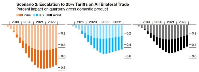 Əgər; əlavə gömrük vergiləri bütün ABŞ - Çin məhsullarını əhatə edərsə, bazarlar cavab olaraq ani və kəskin düşərsə, qlobal iqtisadiyyat 2021-ci ildə 600 milyard dollar azala bilər.