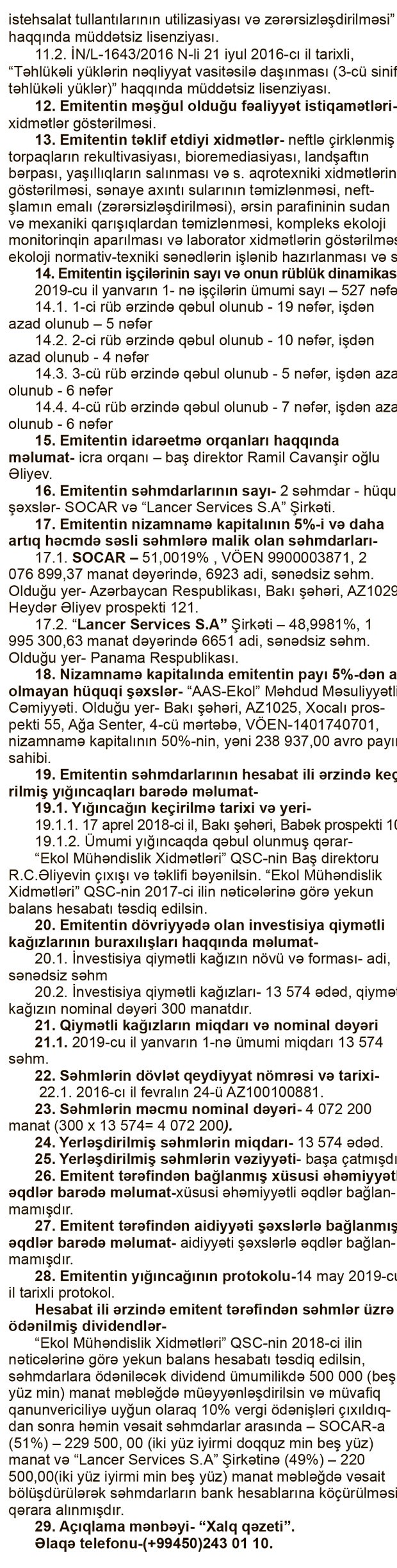 “Ekol Mühəndis Xidmətləri” QSC 2018-ci ili 2 milyon 11 min manat xalis mənfəət ilə başa vurub. Halbuki, QSC 2017-ci ili 1 milyon 151 min manat zərər ilə bağlamışdı.