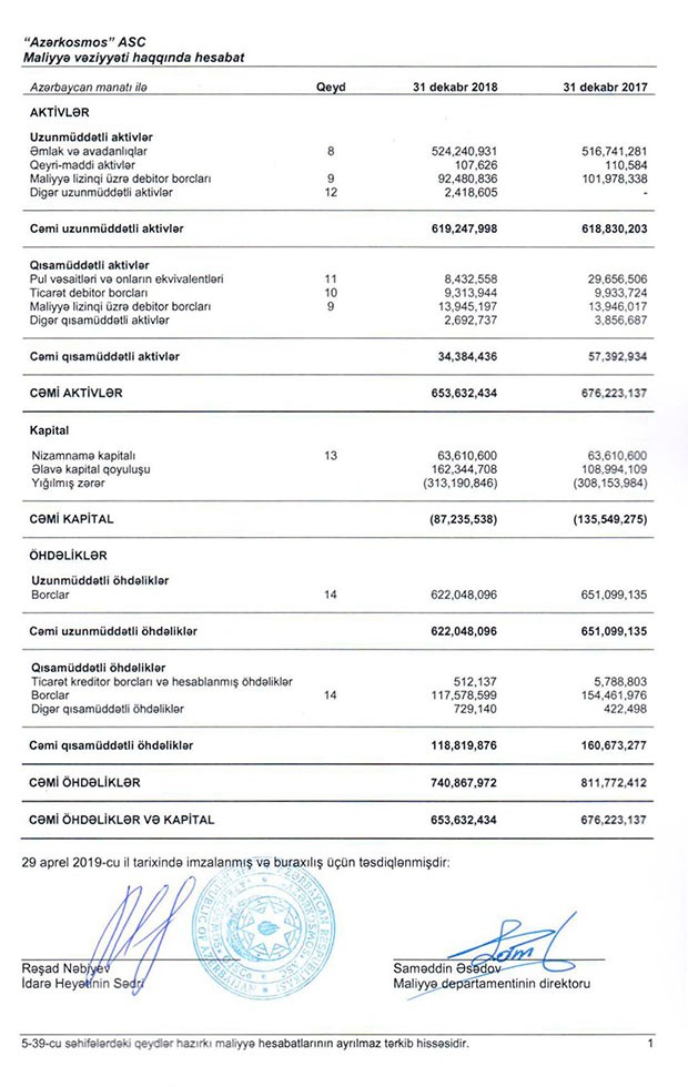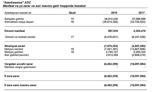 2018-ci ilin sonunda “Azərkosmos”un yığılmış zərəri 313 milyon 191 min manat təşkil edib. 2017-ci ilin sonunda bu rəqəm 308 milyon 154 min manat idi.