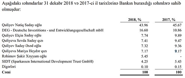 Həmçinin Quliyev Elçin Saday oğlunun, Quliyeva Sevda Saday qızının, Quliyev Saday Əsəd oğlunun, Quliyeva Mariya Heydər qızının və SIDT-nin (Sparkassen International Development Trust GmbH) payları azalıb.