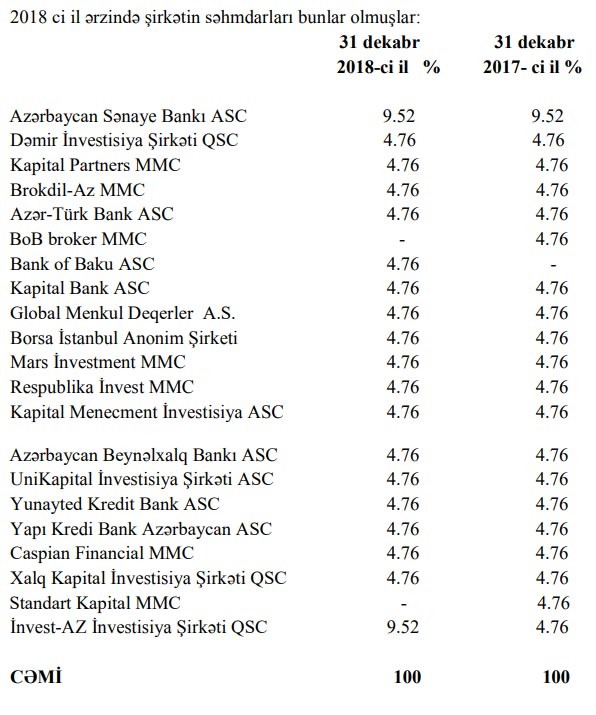 Qeyd edək ki, ötən il Bakı Fond Birjasının səhmdarlarının sayı 20-dən 19-a düşüb. Ən böyük səhmdarlar İnvest-AZ İnvestisiya Şirkəti (9,52%) və Azərbaycan Sənaye Bankıdır (9,52%). Digər 17 səhmdar hər biri 4.76% paya malikdir.