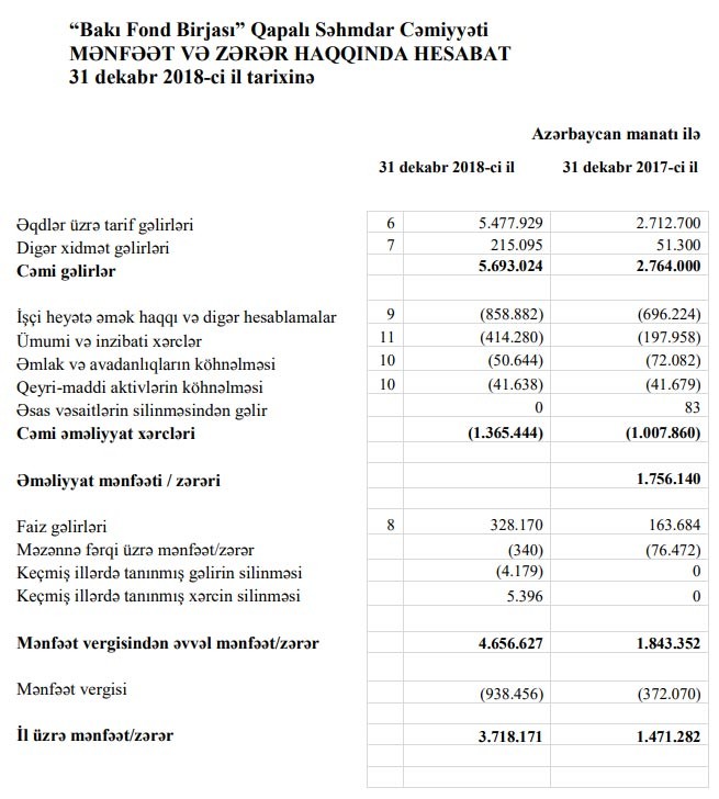 Qeyd edək ki, Bakı Fond Birjası ötən ili 3 milyon 718 min manat xalis mənfəət ilə bşa vurub. Birja 2017-ci ili 1 milyon 471 min manat xalis mənfəət ilə bağlamışdı.