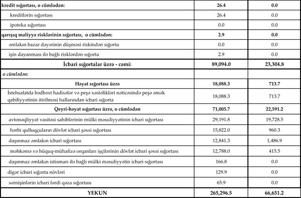Könüllü sığorta bazarı üzrə haqlar 176.2 mln. manat, ödənişlər isə 43.4 mln. manat təşkil edib. İcbari sığorta bazarı üzrə haqlar 89.1 mln. manat, ödənişlər isə 23.3 mln. manat olub.