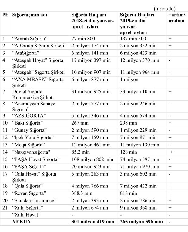 2019-cu ilin yanvar-aprel ayları üzrə sığorta şirkətlərinin hesabldığı sığorta haqları və sığorta ödənişləri haqqında məlumat (lar açıqlanıb.